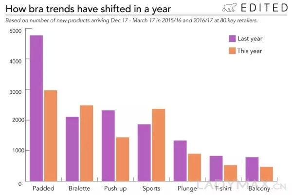 数据机构EBITED在2017年针对维密在内的全球80家内衣零售商进行了分析,发现有钢圈支撑型内衣销量同比下降50%,内衬型胸衣则同比下降22%。与之相反的是,新型无钢圈内衣同比增长18%和运动内衣增长27%。