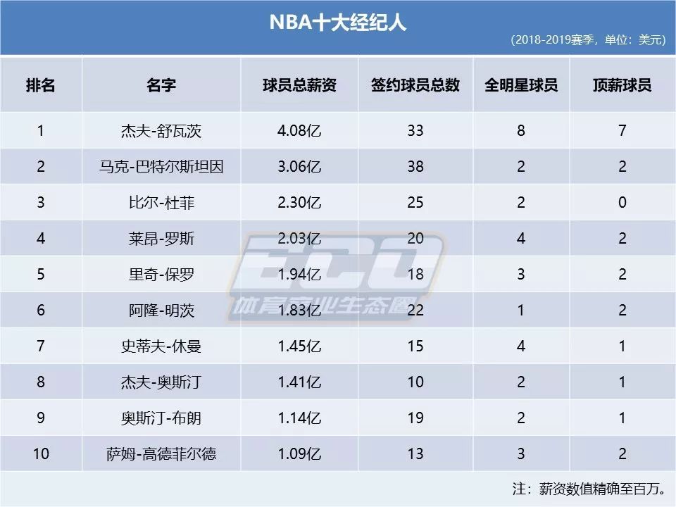 排名榜单第一的杰夫-舒瓦茨是体育经纪公司Excel Sports Management的得力干将。旗下有乐福、格里芬、阿尔德里奇、庄神、麦科勒姆、约基奇、怀特塞德、巴恩斯、卢比奥等33位NBA签约球星,其中有8位全明星球员。