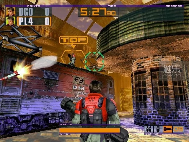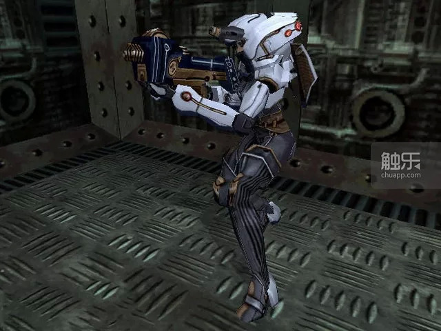 AM2的《Outtrigger》是一款带有美式风味的射击游戏,街机版于1999年推出,直到2001年才发售DC版。AM2的很多员工喜欢《雷神之锤》和《军团要塞》等FPS游戏,《Outtrigger》混合了二者的特色,可以在地图上拾取强化道具,不同职业拥有不同的能力。为了照顾不适应第一人称视角的玩家,游戏也提供了第三人称视角。DC版对手柄瞄准进行了一定辅助修正,但想要最佳效果,还是需要用到游戏同捆的鼠标。本作证明AM2在FPS领域也有两把刷子,可惜此后他们并未深入探索这一类型。