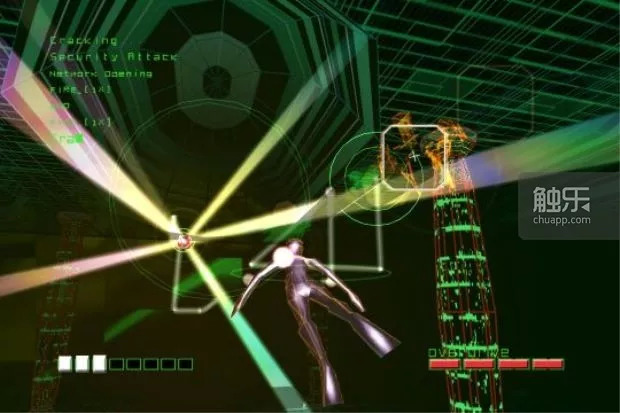 《Rez》是水口哲也在《太空频道5》之后的又一款名作,关卡变为类似《铁甲飞龙》的射击玩法,但重心并非射击,而是画面和音乐对操作的同步反馈,将视觉、听觉和触觉(振动)结合到一起,配合迷幻的美术风格,产生“通感”(各类感觉同步)的效果。