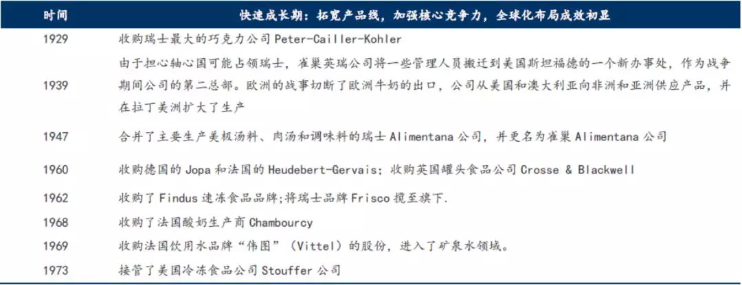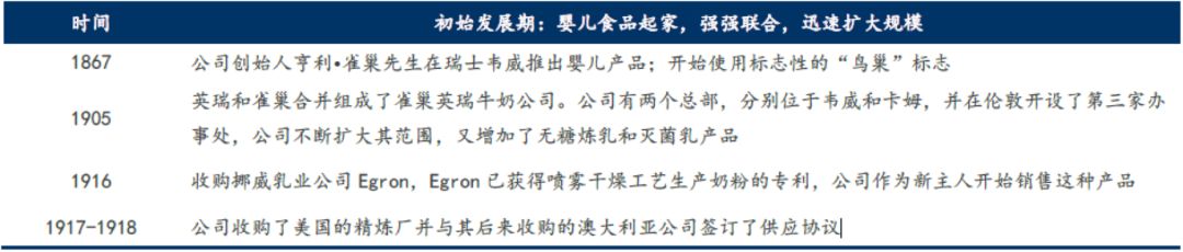1867年雀巢以婴儿食品起家,1905年与当时的竞争对手英瑞炼乳公司合并,当时雀巢公司和英瑞公司已拥有20多家工厂,并开始借助海外子公司建立跨越非洲、亚洲、拉丁美洲和澳大利亚的销售网络。一战爆发对炼乳和巧克力的需求增加,雀巢抓住历史机遇扩大生产,收购了美国和澳大利亚的加工工厂,战争结束时已拥有40 家工厂,在这阶段雀巢推出了巧克力、无糖炼乳、灭菌乳、奶粉等产品。