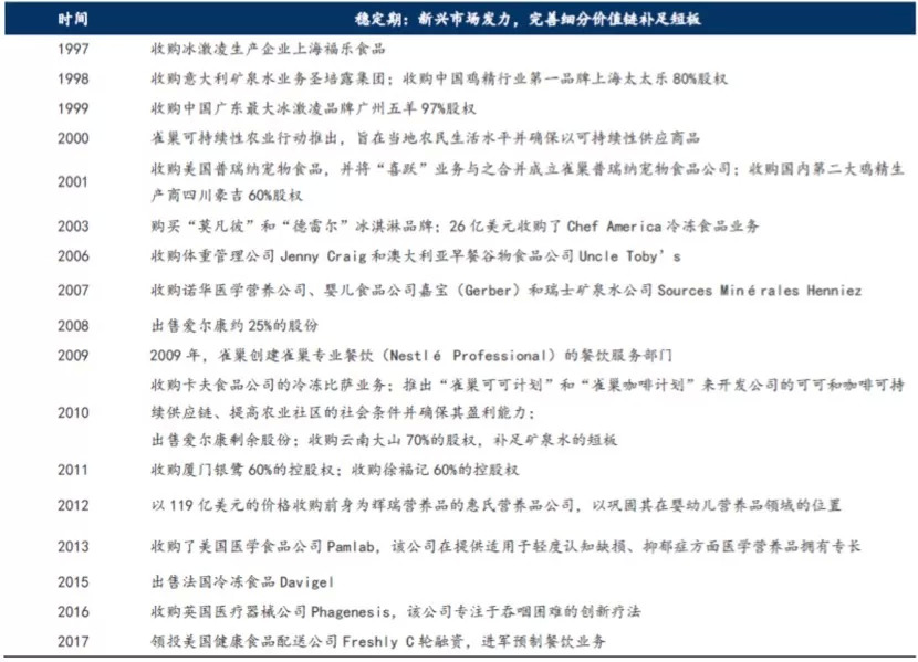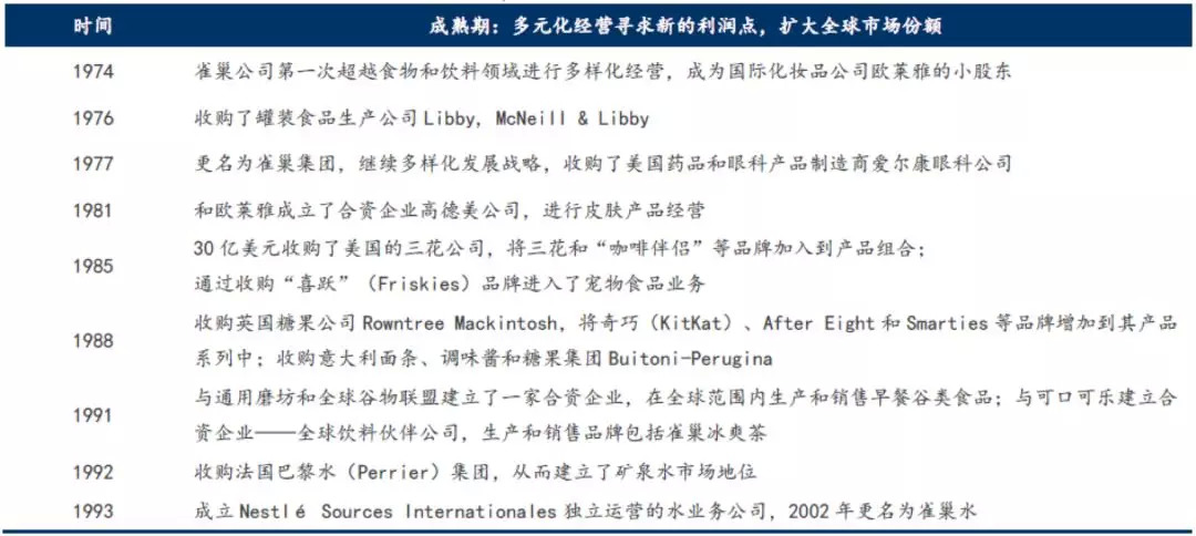 按照不同阶段的业务重心不同,我们将雀巢分为初始发展期、快速成长期、成熟期以及稳定期四个阶段,其中在初始发展期,公司以婴儿食品起家,通过强强联合迅速扩大规模;在快速成长期,开始拓宽产品线、加快全球化布局;在成熟期,持续推进多样化经营,进入了药品和化妆品领域;在稳定期,公司在新兴市场上发力,完善细分价值链、补足短板。