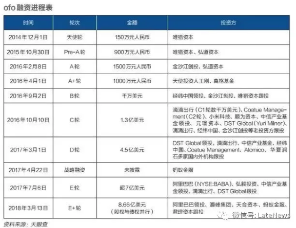向ofo汹涌而来的,除了敌人,还有金钱和欲望。公开资料显示,ofo在2016年10月至2017年7月共完成四轮融资,从C轮到E轮,总融资额超过12.8亿美元,约合88.9亿元人民币。涉及投资方包括滴滴、阿里、小米、蚂蚁金服、DST、中信产业基金等十多个明星资本。(同时期摩拜披露的融资额超9.15亿美元,约合63.5亿元人民币。)