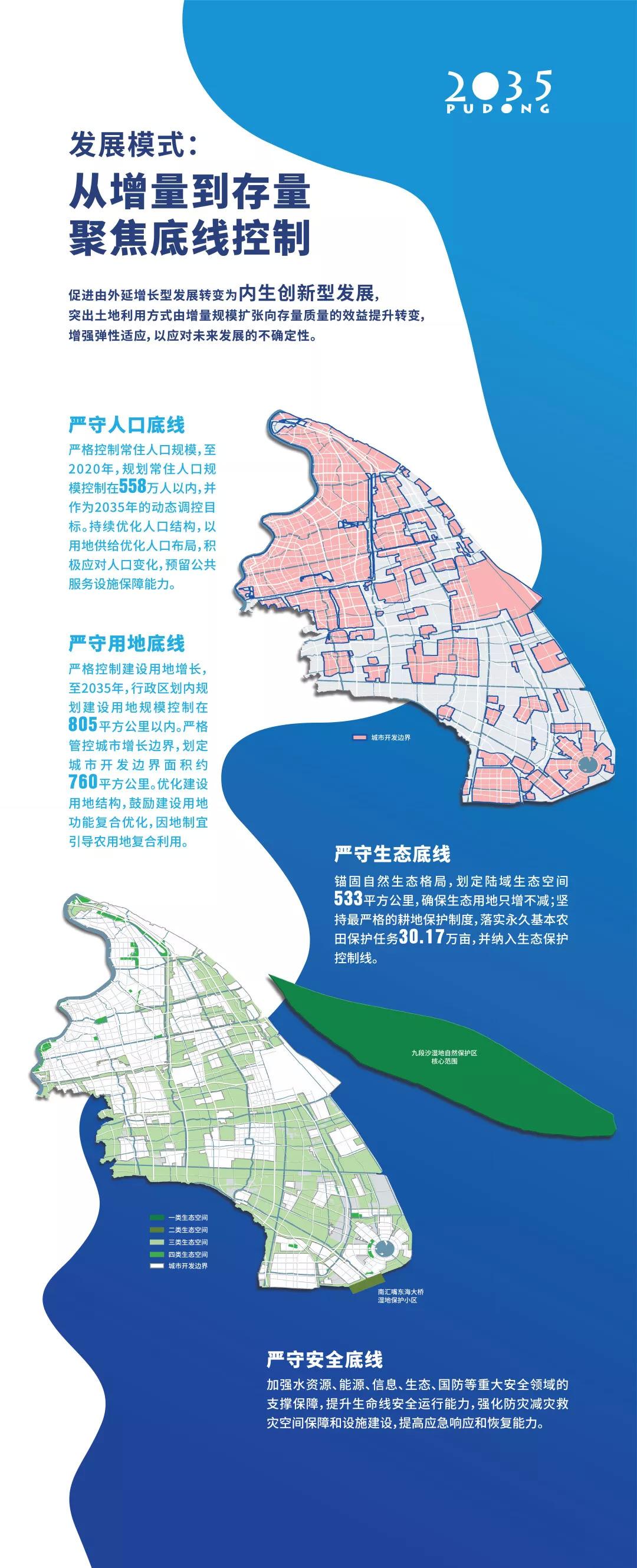 突出底线思维,是“浦东2035”规划的重要内容。在资源紧约束的背景下,浦东将转变传统发展路径,倡导绿色发展方式和生活方式,不断提升城市品质,实现城市可持续发展。比如,聚焦存量用地优化与减量化,以规划建设用地总量锁定为前提,积极探索渐进式、可持续的有机更新模式。规划草案提出:
