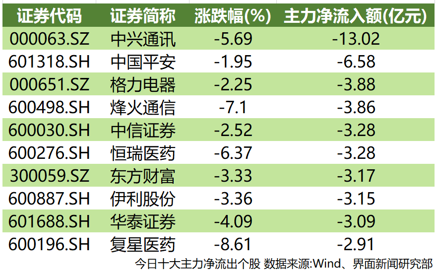 两市主力资金净流出额超1亿元的个股数量为47只。受突发利空因素影响,中兴通讯(000063.SZ)遭到主力疯狂抛售,流出额达13.02亿元高居榜首。烽火通信(600498.SH)也受到影响流失主力资金3.86亿元,跌幅超7%。中国平安(601318.SH)和格力电器(000651.SZ)分列榜单二三,主力净流出额达6.58亿元和3.88亿元。医药股全线跳水,恒瑞医药(600276.SH)、复星医药(600196.SH)跌幅超6%,主力资金分别净流出6.37亿元和8.61亿元。