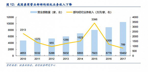 安信证券非银金融首席分析师赵湘怀认为,早期交易还必须通过现场或电话下单,然后由交易所的“红马甲”(证券交易员)将指令输入交易主机;同时,券商营业部提供了投资者交流股票的场所,因此网点的数量和布局是券商的核心竞争力。但随着佣金率和交易额的下降,券商部均经纪业务收入也明显下降,营业部和经纪业务人员的费用开支成为券商的负担。纯粹通过网点和人员扩张的模式已经失效,线下渠道面临转型。
