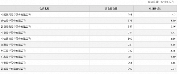 wind数据和上交所公开信息显示,截至目前,营业部数量过百的券商已有34家,排名前十位的券商分别为银河证券、安信证券、国泰君安证券、中泰证券、中信建投证券、海通证券、长江证券、广发证券、华泰证券以及国盛证券。其中,银河证券以488家位列第一。