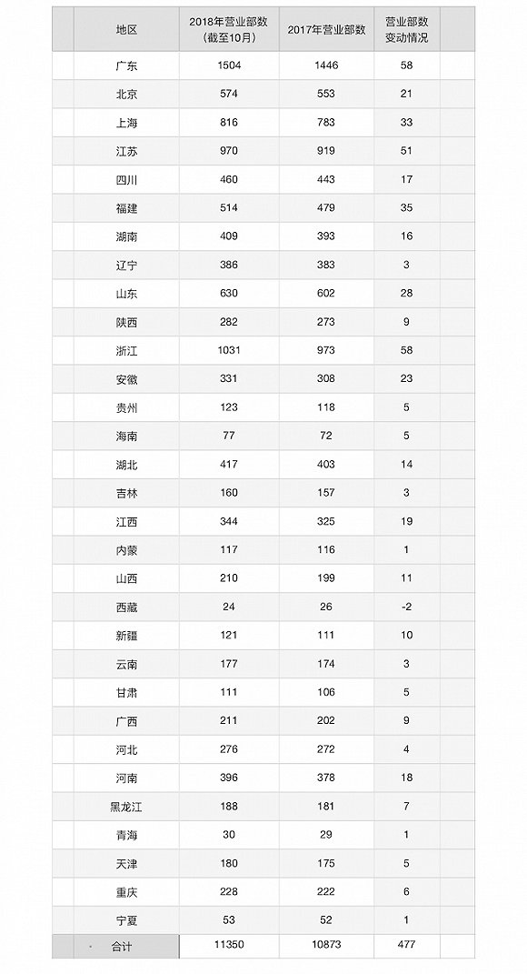 此外,今年以来,券商撤销营业部的情况屡见不鲜。据媒体统计,2018年前三季度,券商共撤销营业部45家,已超过2017年全年的36家。
