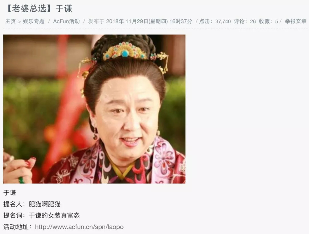 从11月29日开始,A站推出了一个名为“老婆总选”的线上活动。规则也很简单,只要是A站的注册用户,就可以在评论区留言的方式提名自己心目中的“三次元老婆”,并通过投票的形式,最终选出2018年度的“A站老婆”。