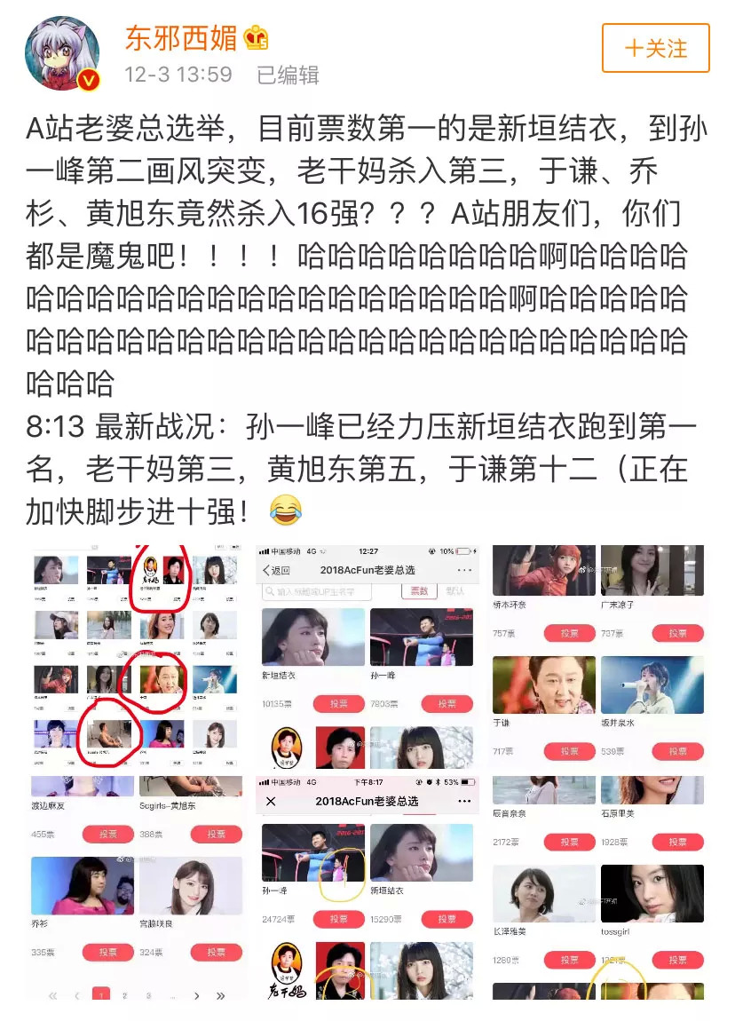 实际上,此次A站所举办的“老婆总选”活动,是这家弹幕视频网站在最近两年时间内,所举办的第一场真正意义上引起了广泛关注的线上活动。迄今为止,其相关话题 #A站朋友都是魔鬼吧# 在微博上获得了超过900万次的阅读,#孙一峰票数超过新垣结衣# 在微博上的阅读则超过了2200万,参与相关讨论的网友中不乏一些知名的电竞圈、动漫圈、日剧圈大号。