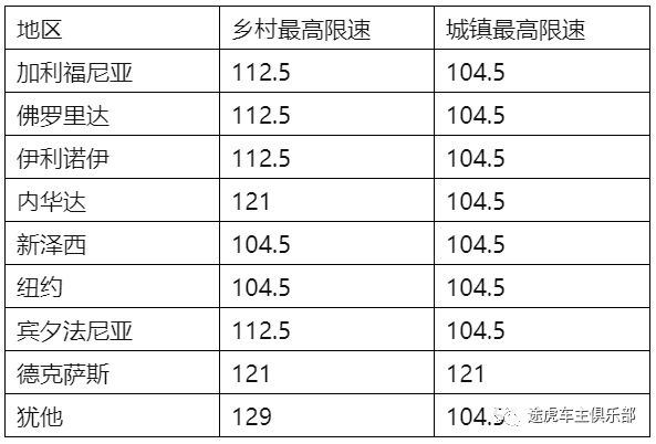 美国不仅各州的高速公路最高限速不同,在每个州内,最高限速也会按乡村和城镇的划分有所区别。因为美国的速度单位为英里/小时,为了便于国内读者阅读,已经换算成了公里/小时列出。