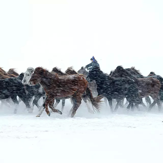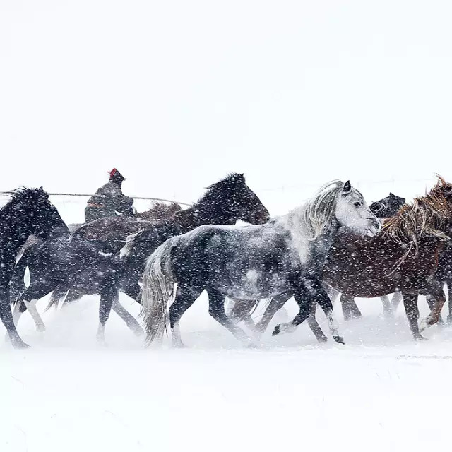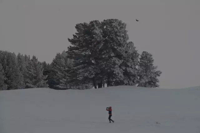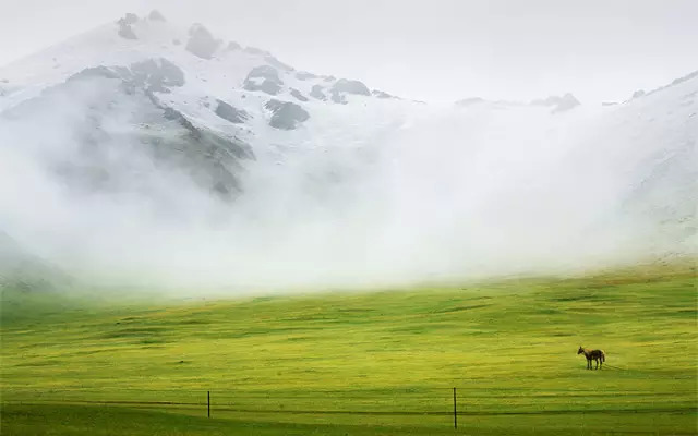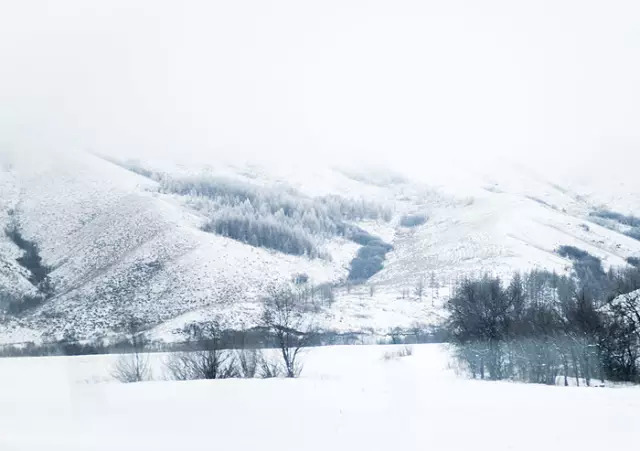 天山山麓的雪中浓雾 如果雪后初晴,也是拍摄雪景的大好时光,此时由于低角度的太阳色温,遭遇雪地的高色温,往往会变幻出变化万千的奇妙色彩,此时要严格控制好白平衡,通常此时光线不会太亮,三角架必不可少。