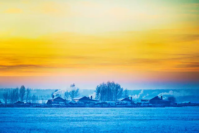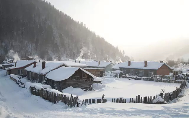 侧逆光拍摄的雪中村庄,白茫茫一片里会景物很有层次感觉