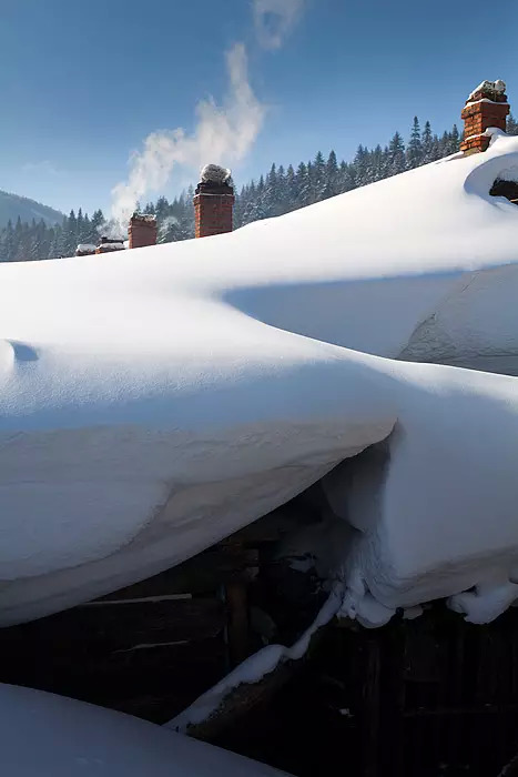 侧光下拍摄的屋顶局部,白雪有了光影,非常有质感