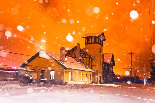 夜色中的阿尔山火车站,大雪纷飞。焦距35mm,光圈F6.3,快门1/6秒,ISO 2200,对火车站屋顶测光对焦,减曝光一档,强制闪光灯,手持,一次成像。