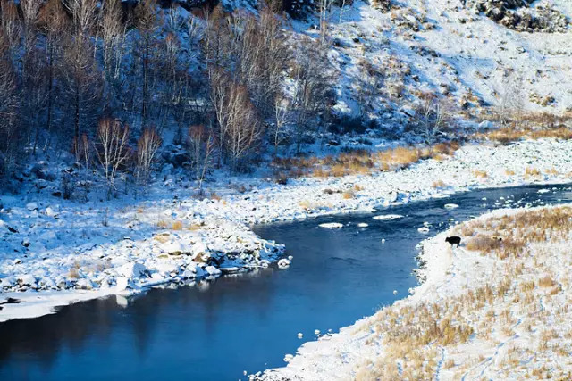 当大雪刚刚降临,还没完全覆盖所有事物的时候,这时的拍摄变得十分有趣,尤其在野外拍摄时,山上的岩石和静静流淌的河流,由于位置和表面的凹凸不平,往往形成千变万化的画面构成,拍出富有水墨山水画风格的风光作品,十分简单。