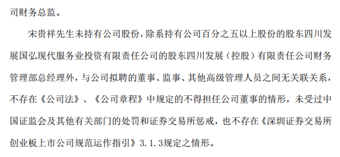 细心的投资者可能发现,上述人选大多延续上一届的阵容,唯李铁军、宋贵祥为没有见过的新面孔。原来此提前换届的建议来自硅宝科技单一第一大股东四川发展国弘现代服务业投资有限责任公司(下称国弘现代),国弘现代目前持有硅宝科技5891.54万股,占总股本比例17.8%。资料显示,李铁军2017年3月至今,任四川发展(控股)有限责任公司(下称川发展)资本运营部总经理,并任国辰产业投资基金管理有限公司投决会委员,曾还有在四川证监局的任职经历。宋贵祥2018年4月至今,任川发展财务管理部经理,并担任四川省城乡建设投资有限责任公司董事、财务总监,四川发展国瑞矿业投资有限责任公司财务总监。国弘现代川发展的全资子公司,川发展又是四川省政府的国有独资公司,是四川省金融控股、产业投资引领、企业改革发展“三位一体”的国有资本运营平台。也就是说,在川发展入股多时之后,终实收了董事会2个席位。