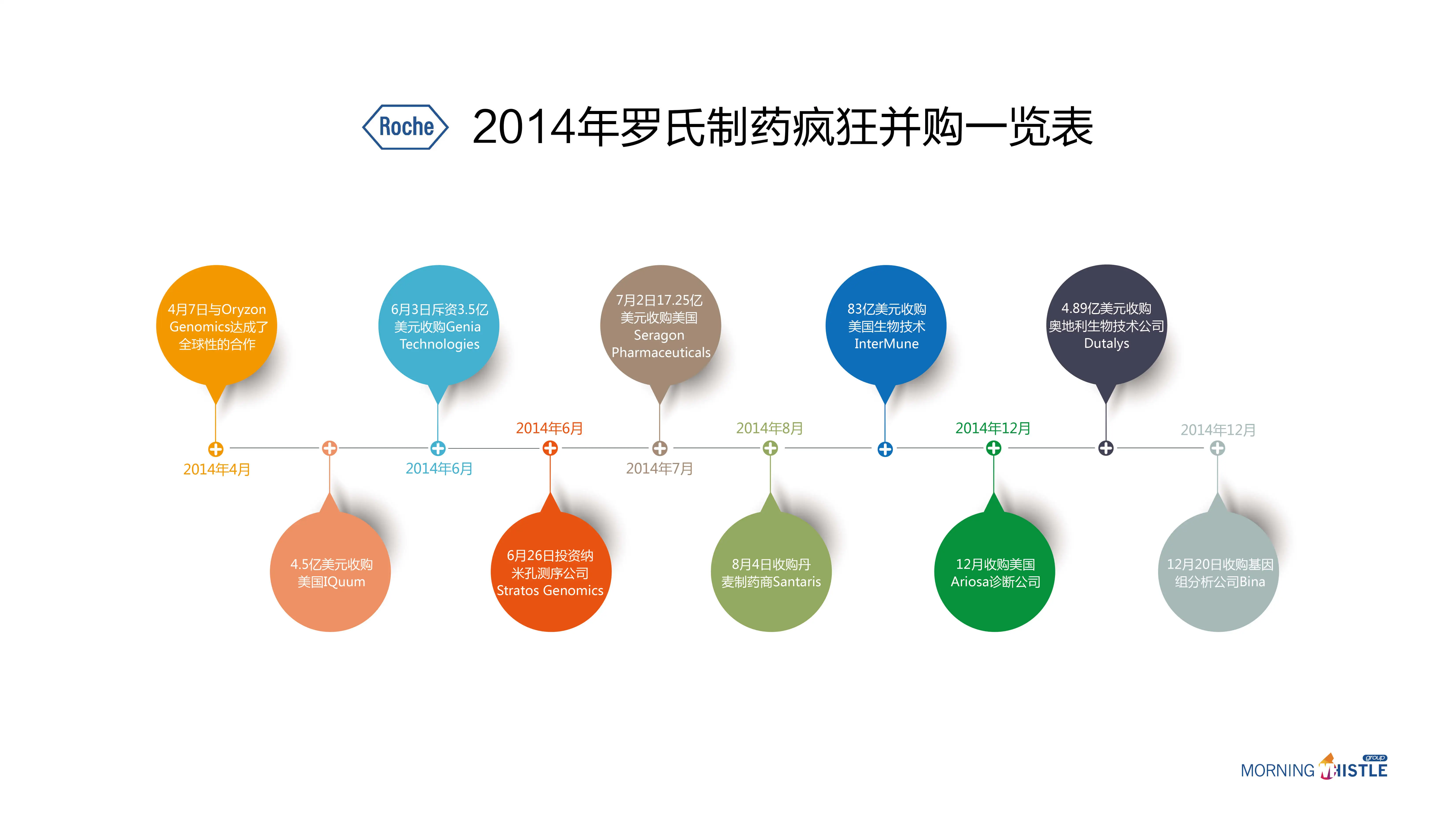2014年罗氏制药掀起了基因组学和分子诊断领域的收购狂潮,根据晨哨研究部的不完全统计,2014年罗氏制药共进行了 10宗并购,涉及遗传、分子诊断、基因测序和生物制药等领域。