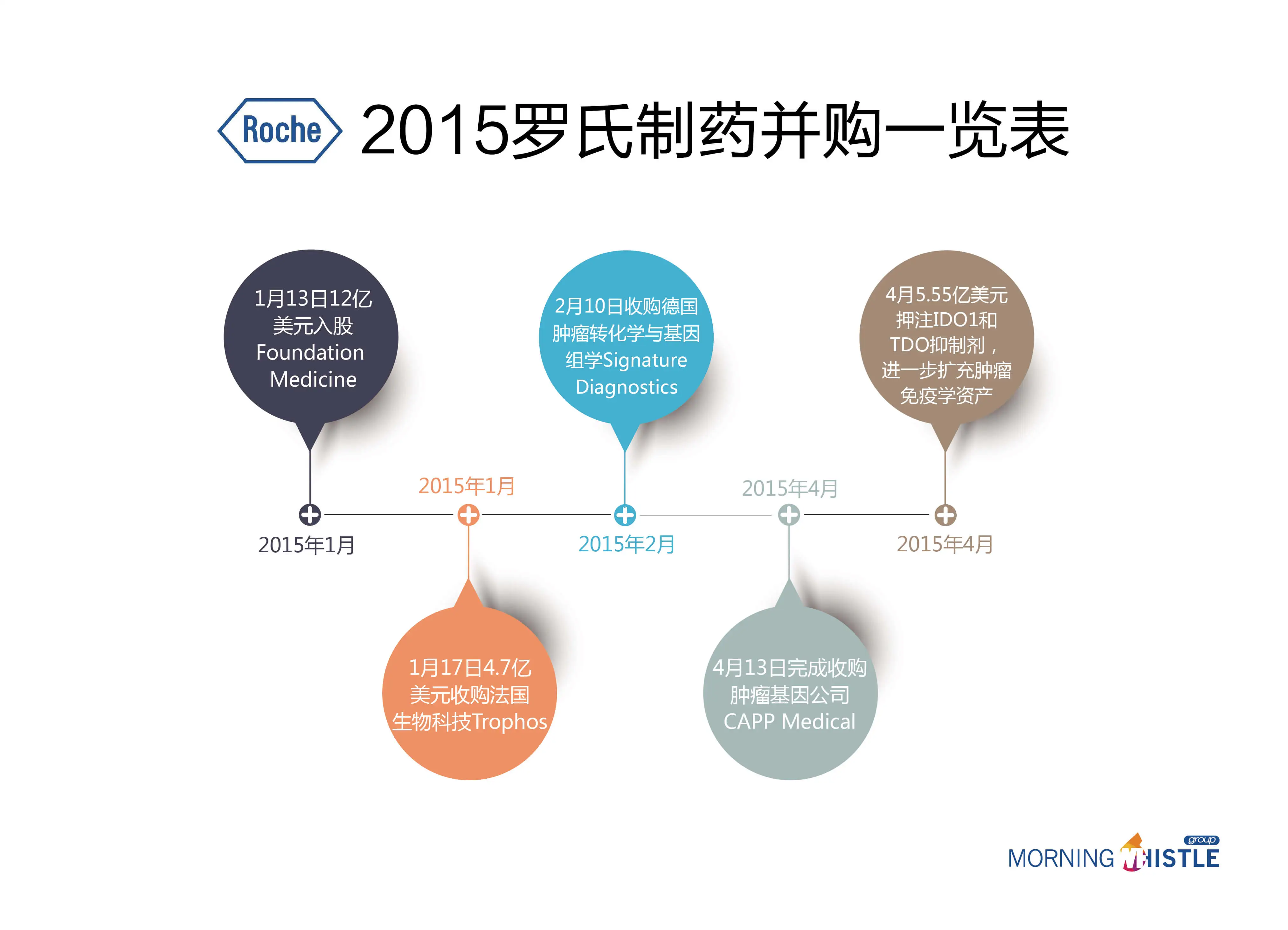 该笔交易是2015年的并购第四单。此前罗氏制药分别收购Foundation Medicine,法国生物科技公司Trophos以及德国肿瘤转化学与基因组学公司Signature Diagnostics。