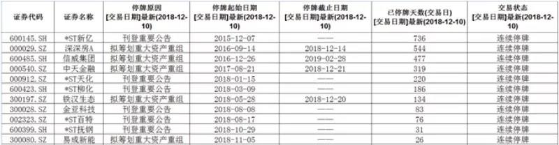 从披露来看,因破产重整,自2015年12月7日起停牌的*ST新亿登上了这份尴尬的最长连续停牌榜之首。