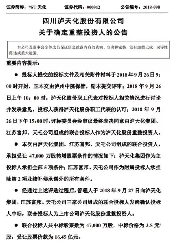 9月底,公司确定由泸天化集团、江苏富邦、天乇公司组成的联合投标人成为公司重整投资人,并于近期签署书面投资框架协议。