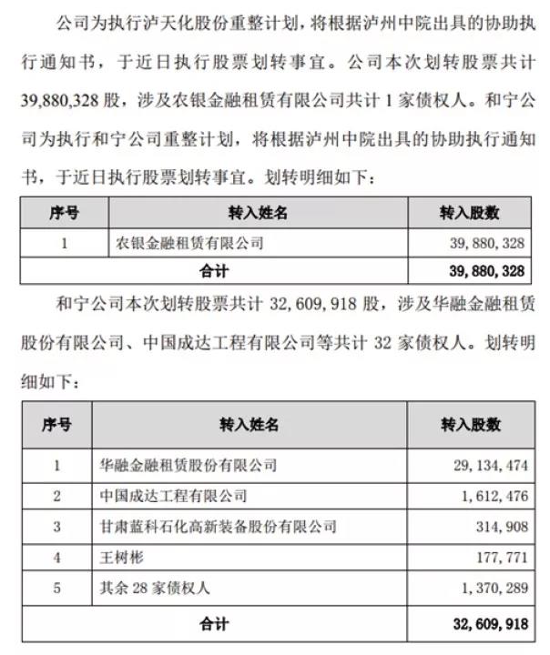 不过,若业绩承诺未能履行,则将由泸天化集团承担补偿责任,并不涉及江苏富邦、天乇公司。11月28日晚,公司进一步披露公司及全资子公司重整计划执行的提示性公告: