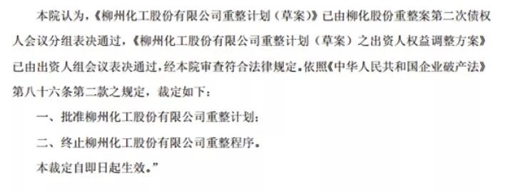 根据11月26日晚公告,因重整失败而导致终止上市的风险得以暂缓。公告显示,柳州中院已于2018年11月26日裁定批准了《柳州化工股份有限公司重整计划》。