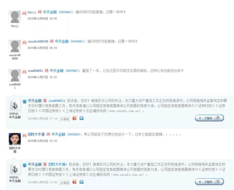 对于中天金融长达300多个交易日的长期停牌,投资者言辞同样犀利。根据最新公告,公司计划于 2018年12月21日前按照披露本次重大资产购买预案或报告书等相关信息。