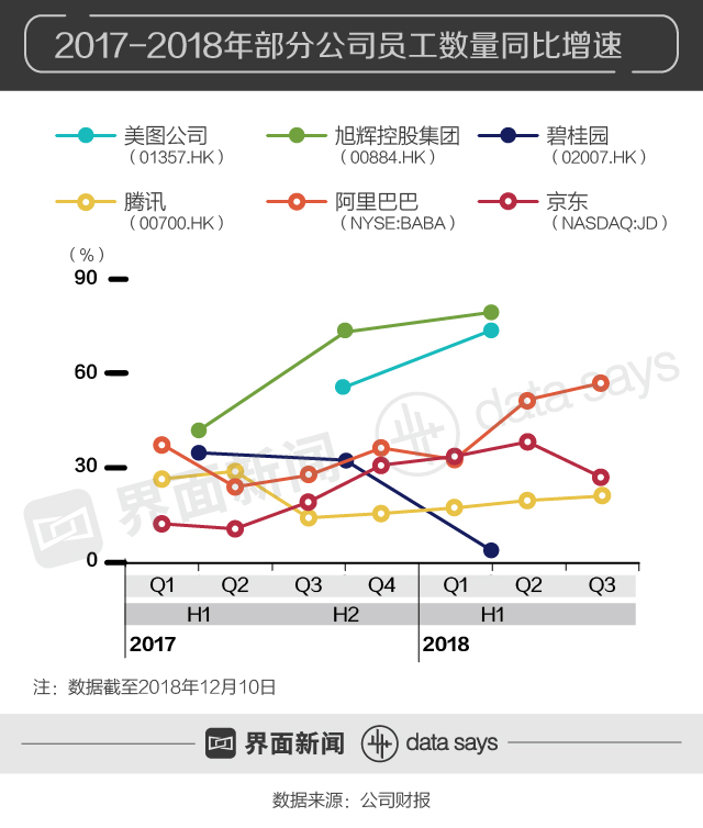 在这六家公司中,碧桂园(02007.HK)上半年和京东(NASDAQ:JD)第三季度的员工数量同比增速分别从32.17%和38.20%降至3.40%和27.10%,其余四家公司员工数量同比增速保持上升。