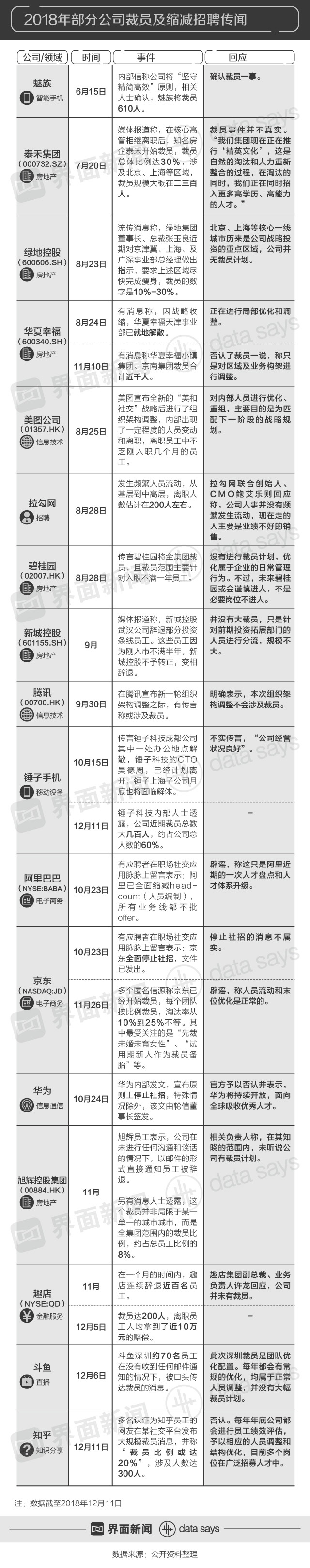 据界面数据(公众号ID:tuli_shuju)不完全统计,2018年先后至少有17家公司被曝出裁员、缩减招聘规模,其中至少有8家互联网公司,6家房企。