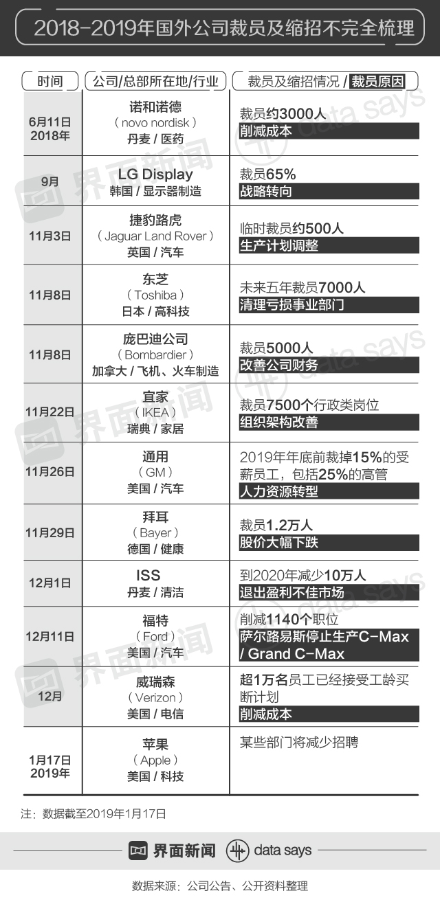 据界面数据(公众号ID:tuli_shuju)不完全统计,2018年先后至少有11家国外公司被曝出裁员,其中包括捷豹路虎、通用和福特3家车企。