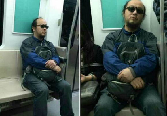 你看他,应了王菲男人发际线后退严重的“咒语”,稀松无力的头发随着发福的身体一起疲沓着,戴着墨镜沉默得像地铁神棍。