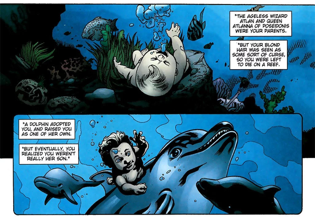 5. 被海豚收养后,灯塔看守人亚瑟·库里成为了他的养父,还给小Orin起了跟自己一样的名字——亚瑟。在这个故事线中,海洋领主奥姆是亚瑟同父异母的弟弟,父亲是第3条中提到的巫师亚特兰,母亲则是个爱斯基摩女子。