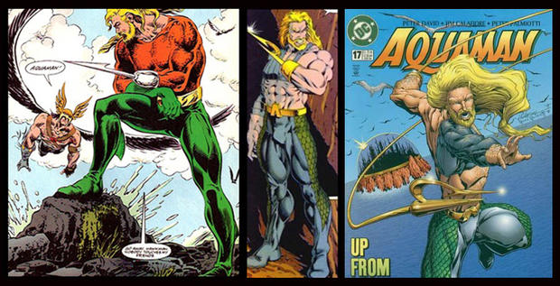 6. 在早期漫画中,亚瑟在水上和水下都是呼吸畅通无阻,这与电影中的设定是一样的。而在白银时代的漫画中,就像超人怕氪石,绿灯侠怕黄色(真的是颜色的那个黄色,不要因为小贱贱演过就觉得是别的黄色)一样,亚瑟必须每小时接触一次水,否则会死掉。在这个设定中,蝙蝠侠给他设计了一种服装,穿上它,海王在陆地上想待多久就待多久了,啧啧,老爷简直人美心善。