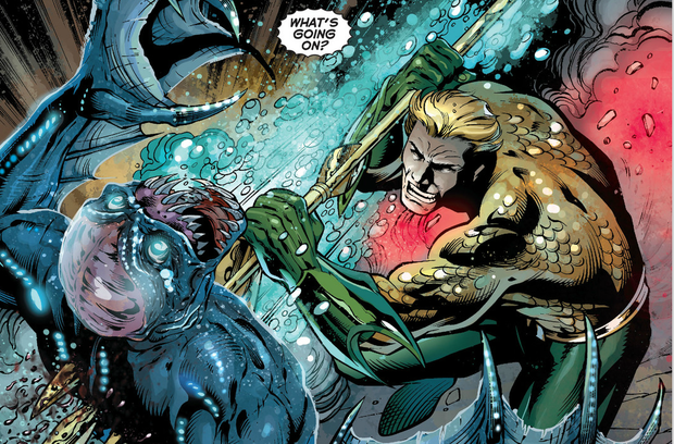 8. 早年间,亚瑟曾被刻画为一个真的能跟海洋生物“说话”的人,不过后来变成了运用“心灵感应”,和它们即使隔着远距离也能沟通。这一点在《正联》中,还得到过蝙蝠侠无情的嘲讽。