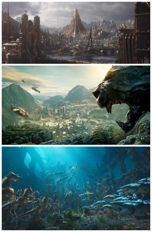 44. 三位英雄的世界相似之处不止如此,《海王》中有海底的亚特兰蒂斯,《雷神》中有仙宫阿斯加德,《黑豹》中有非洲的瓦坎达,都是我们凡人所未曾踏足的“世外桃源”。(但阿斯加德现在已经没了……)