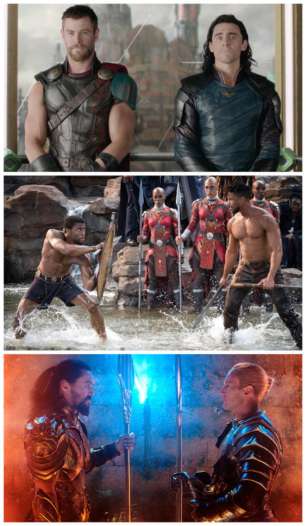 43. “海王”、“黑豹”和“雷神”这海陆空三位爷,在各自的独立电影中,还真是有不少设定相似之处。比如说,每个人面对的反派中都包括自己的兄弟:海王的同母异父弟弟奥姆,雷神“领养”的弟弟洛基,以及黑豹的表弟“杀人魔头”埃里克。