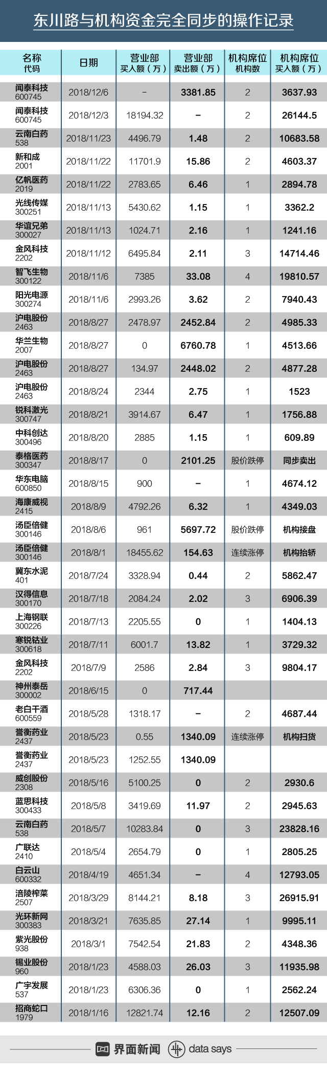 界面新闻记者初步统计,截至目前,申万宏源东川路营业部累计上榜64次,其中41次交易完全与机构席位同步买卖操作,主要涉及涨停机构抬轿或跌停机构接盘等现象,累计买入金额高达189298.92万元,累计卖出金额26603.75万元。