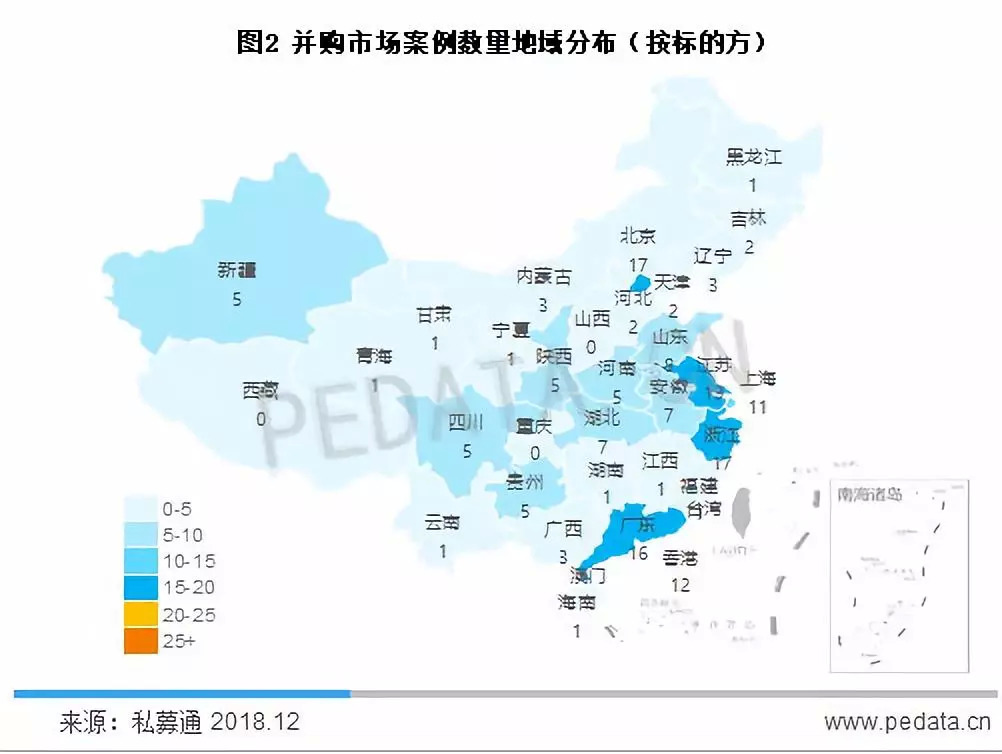 具体来看,2018年11月并购市场共完成167笔并购交易,按被并购企业所属省份来看,167笔交易分布在北上广以及江浙等30个省市、自治区以及香港和海外地区。从案例数量来看,江苏省位列第一,共完成19笔并购交易,占本月并购案例数量的11.38%;北京市与浙江省位于第二位,各完成17笔并购交易,占本月并购案例数量的10.18%;香港位于第三位,共完成12笔并购交易,占本月并购案例数量的7.19%。