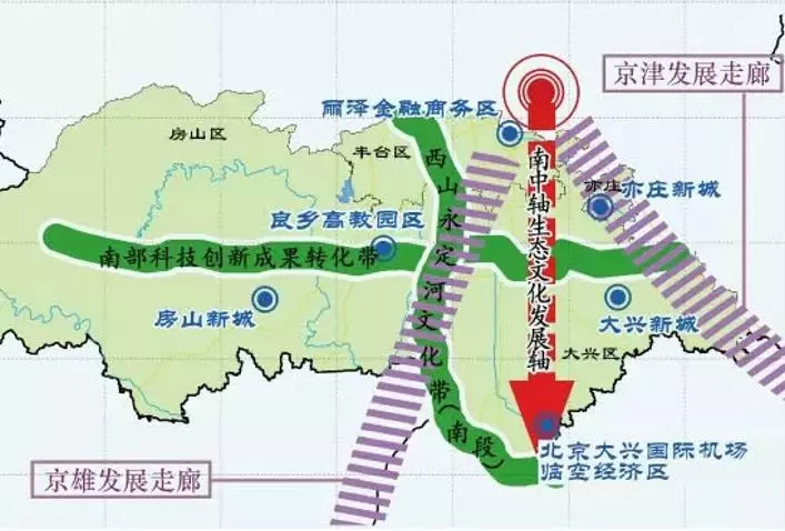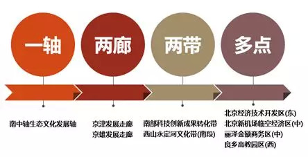 ■两廊:京津发展走廊串联中心城区、通州区、大兴区和津冀地区,京雄发展走廊串联中心城区、南部地区和河北雄安新区。充分发挥功能组团连接作用,完善便捷高效的交通组织体系,促进功能产业梯度转移,优化生态环境,形成京津冀协同发展各种要素流通与集聚的“大动脉”。