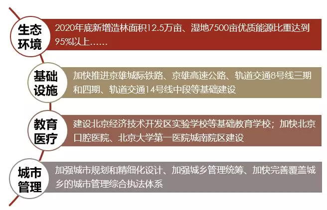本次行动计划的推出,致力通过实施行动计划,使城市南部地区逐步实现更高水平、更有效率、更加公平、更可持续的发展,环境质量和公共服务等短板进一步补齐,交通基础设施和生态品质进一步提升,重点功能区和产业进一步向高端发展,努力建设成为首都发展的新高地。并于2020年底完成以下三大目标: