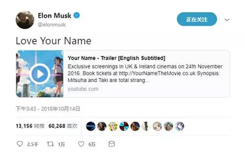 Space-X掌门人、被称为“现实版钢铁侠”的马斯克日前在社交平台上点赞日本动画电影《你的名字》,称:“Love Your Name。”而该片导演新海诚也在平台上与其互动,回应称:“哇!我的荣幸!”