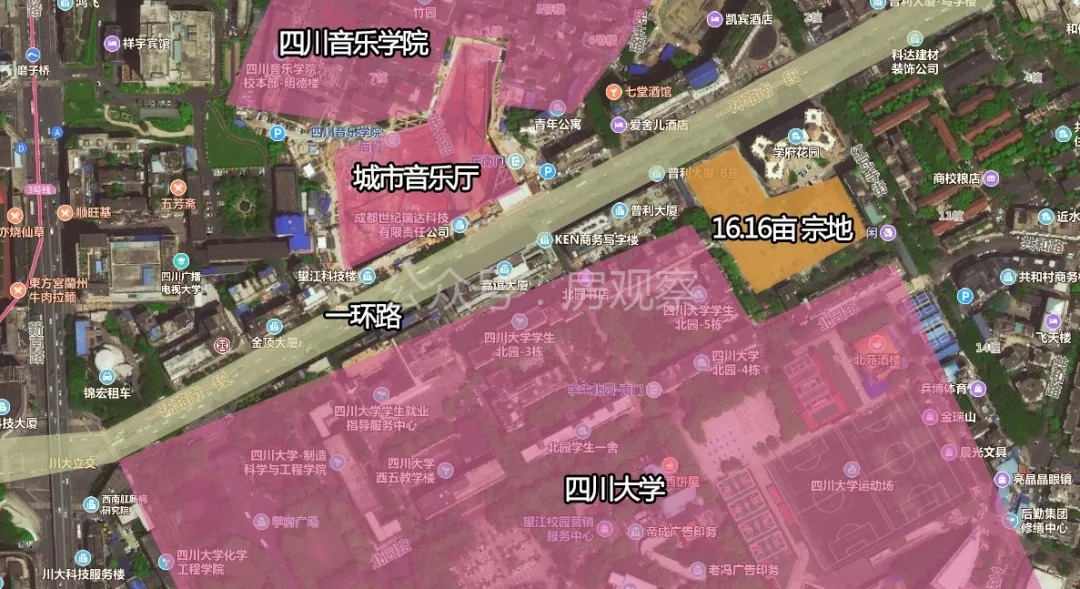 宗地属于红瓦寺板块,地块呈不规则的L形,挨边一环路南一段,一街之隔的西北侧即是正在修建中的成都城市音乐厅,西临普利大厦,东靠学府花园及九三商务楼,南侧紧贴四川大学,夹杂在这些成熟的楼宇之间,这宗待开发地块显得更加袖珍。