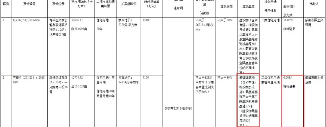 二号宗地:武侯区红瓦寺11、13号,一环路南一段16号;16.16亩住宅兼容商业用地,起拍楼面价14124元/㎡,被成都阳光城迤达置业有限公司以楼面价15940/㎡拿下,溢价率12.8575%。