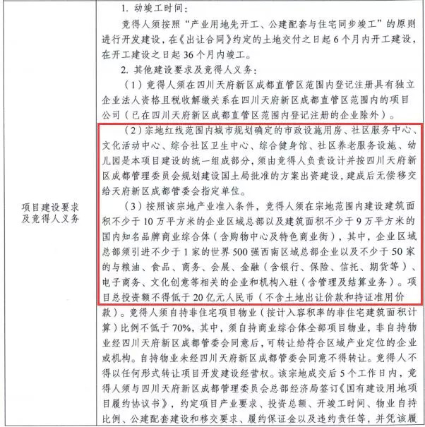 该地块位于天府新区“一中心三城七镇”中的天府中心区域,是重大产业项目用地,将建设建筑面积不少于10万平方米的企业区域总部和不少于9万平方米的国内知名品牌商业综合体,需引进不少于1家的世界500强西南区域总部企业以及不少于50家的与粮油、食品、商务、会展、金融、电子商务、文化创意等相关的企业机构入驻。项目总投资额不少于20亿元人民币。