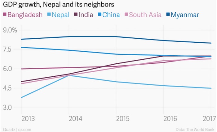尼泊尔是亚洲最贫穷的国家之一。世界银行数据显示,2013年该国GDP为192亿美元,还不足北京市经济体量的6%。即使在地震发生之前,通胀和失业率高企、持续了数年的政治僵局就已导致该国基础设施等投资严重不足,增长前景暗淡。亚洲开发银行最近预测,截至今年7月15日(尼泊尔财政年度起于上年度7月16日),尼泊尔的年增长将为4.6%,低于上一财年的5.2%,也低于政府5.5%的增长目标。