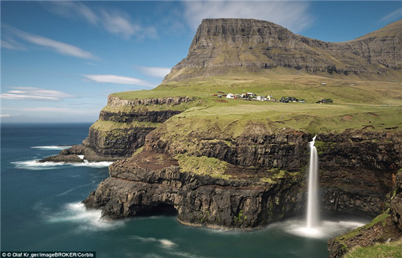 加萨达鲁(Gasadalur)位于北大西洋法罗群岛中Vágar岛的西部,岛上仅有16名原住民。村内的小溪直接坠下悬崖落入大西洋,形成壮观的瀑布。