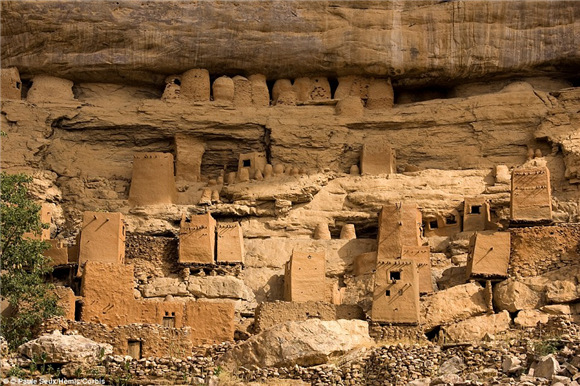 Bandiagara村庄内的小屋、粮仓和祭坛等建筑全部由红色粘土制成,具有浓厚的原始韵味。
