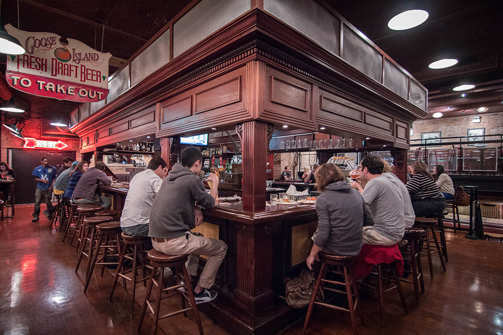 每天下午五点左右,离芝加哥河不远的鹅岛精酿啤酒餐厅里便会逐渐开始热闹起来。附近的居民,艺术家模样的年轻人,穿着乐队T恤的嬉皮士……酒吧内部被站着聊天的人们塞得满满当当,你需要穿过好几拨人才能接近吧台要一杯酒。