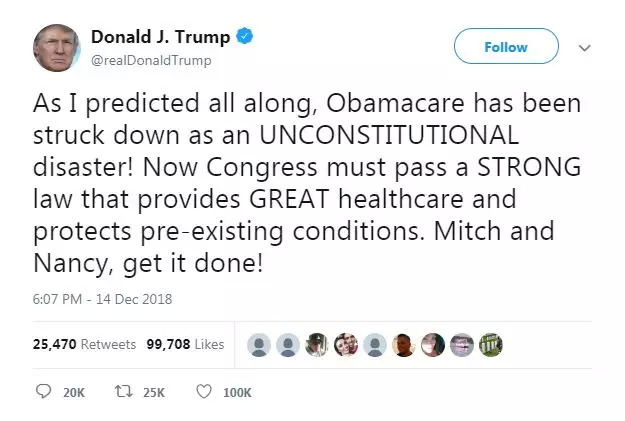 北美12月14日,得克萨斯州联邦法官裁定奥巴马“平价医疗法案”违宪,引来特朗普一片叫好声。他在推特上说,这是一个好消息,“奥巴马医保法案”正如我一直以来预测的,被宣布为一个违宪的灾难了!现在,国会必须通过强有力的法律,为美国人提供更好的医疗保健,并且保护现在的体系。